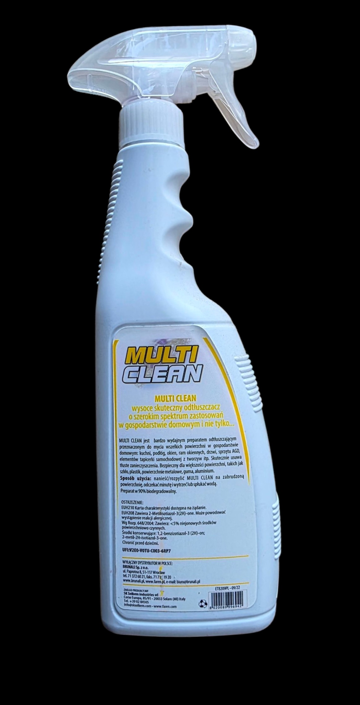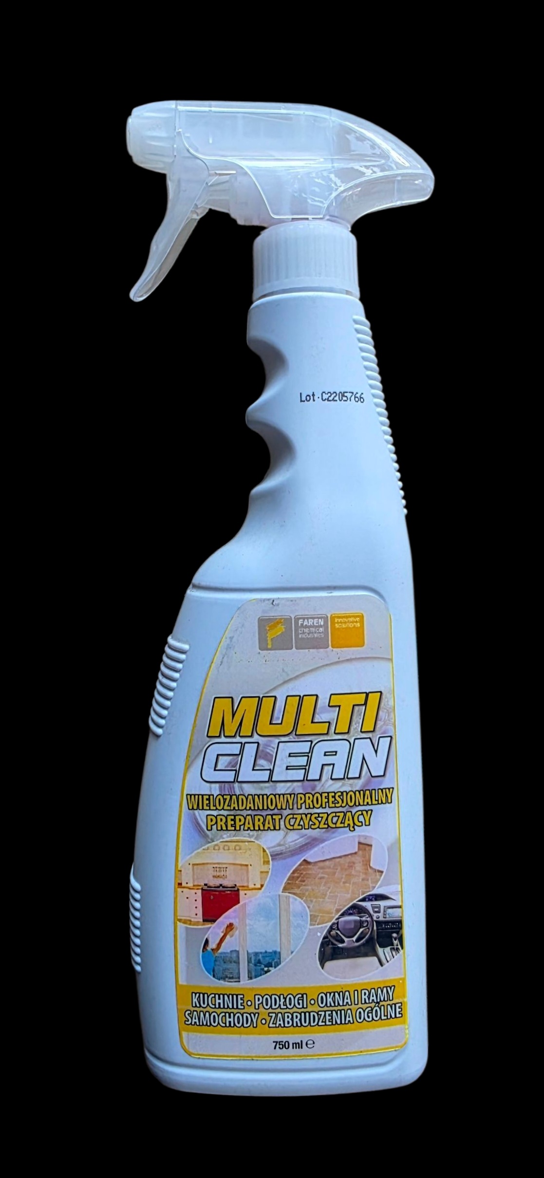 - rozpylić środek na zabrudzoną powierzchnię, odczekać minutę i wytrzeć/spłukać wodą.
