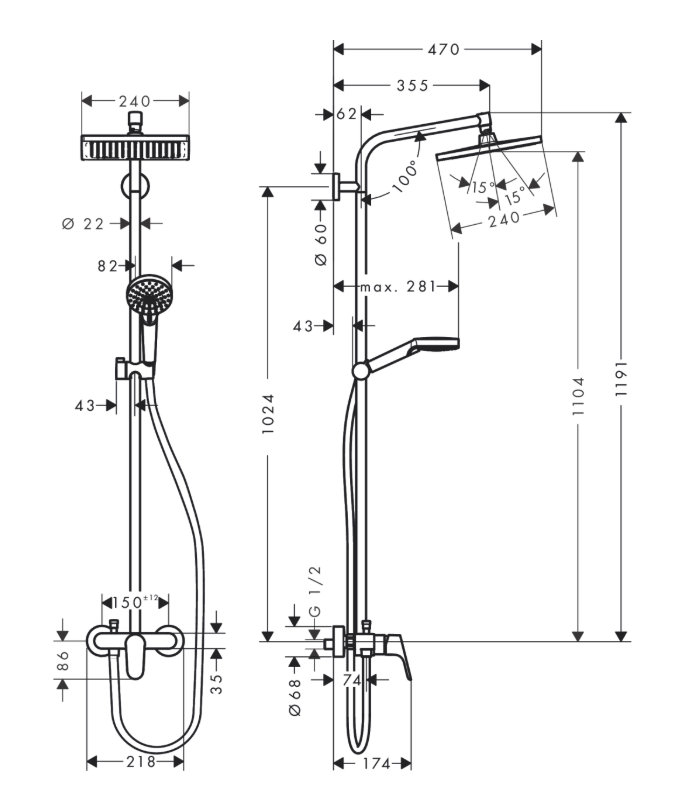 • długość ramienia prysznicowego: 350 mm